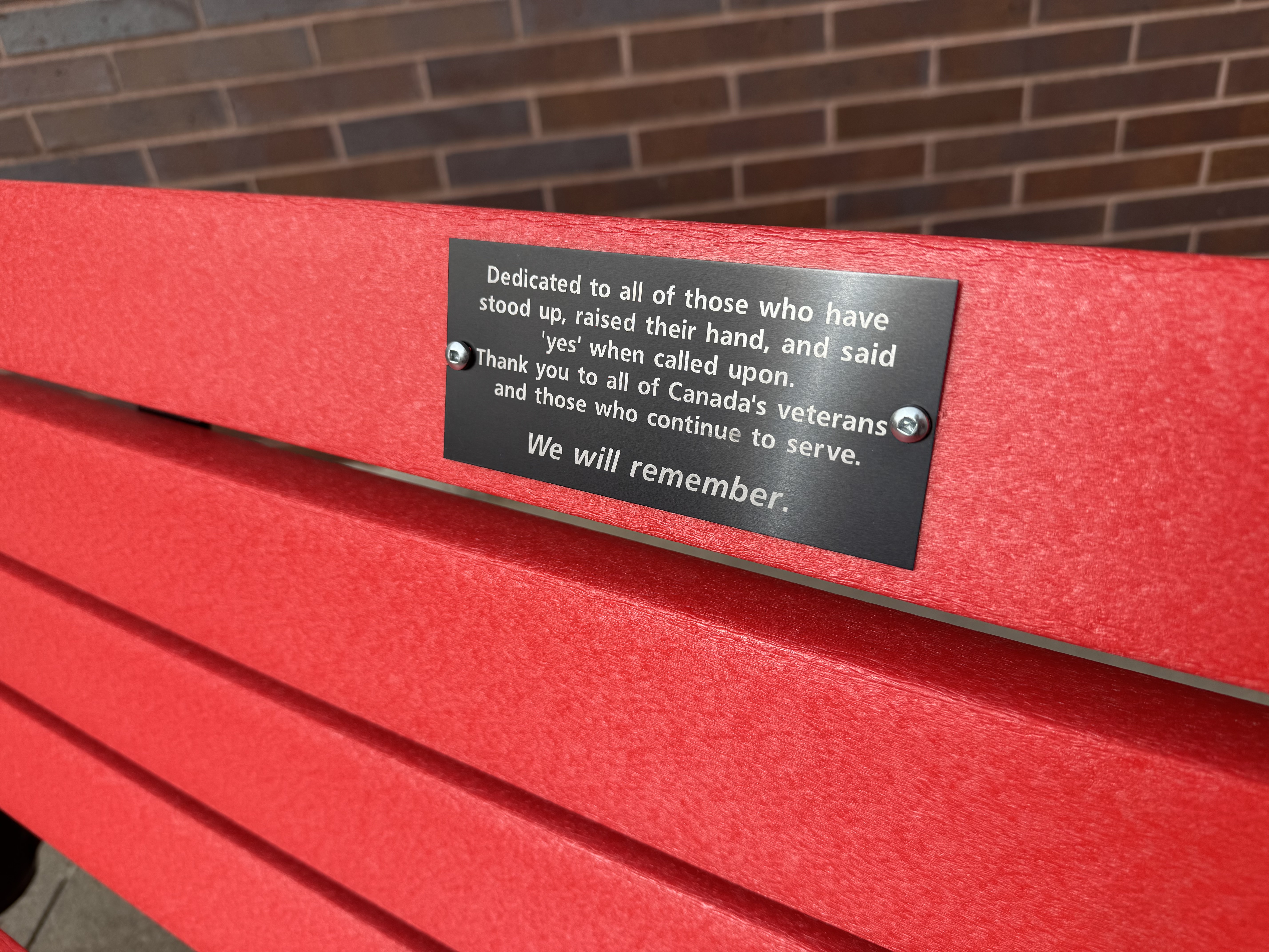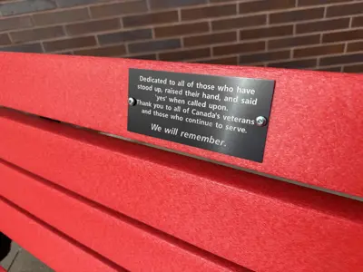 The red benches have a dedication plaque on them that reads “Dedicated to all of those who have stood up, raised their hand, and said ‘yes’ when called upon. Thank you to all of Canada’s veterans and those who continue to serve. We will remember.”